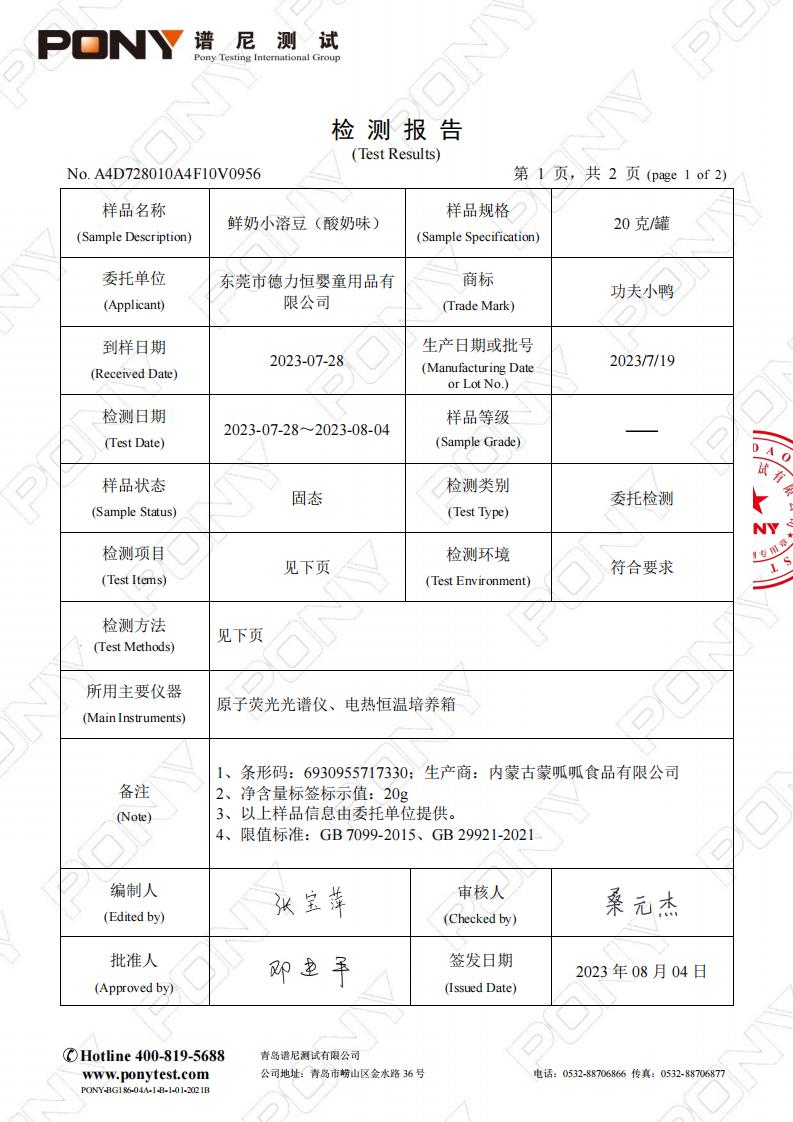 鲜奶小溶豆(酸奶味)检测报告