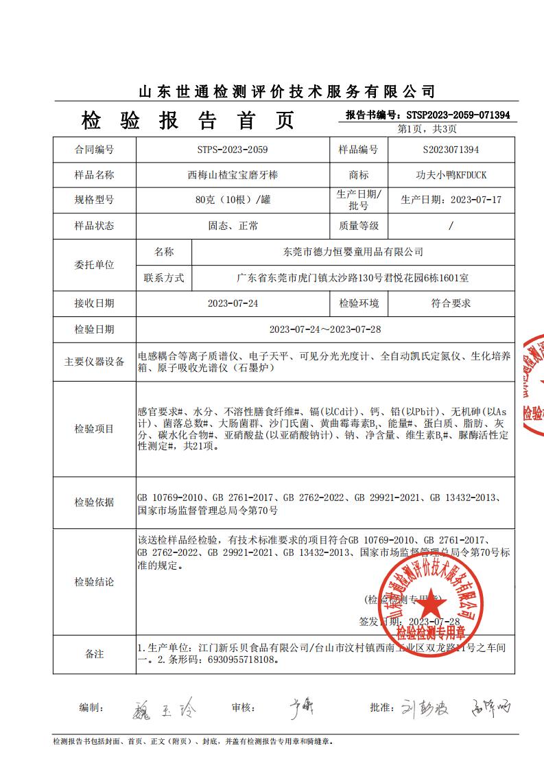 西梅山楂宝宝磨牙棒检测报告